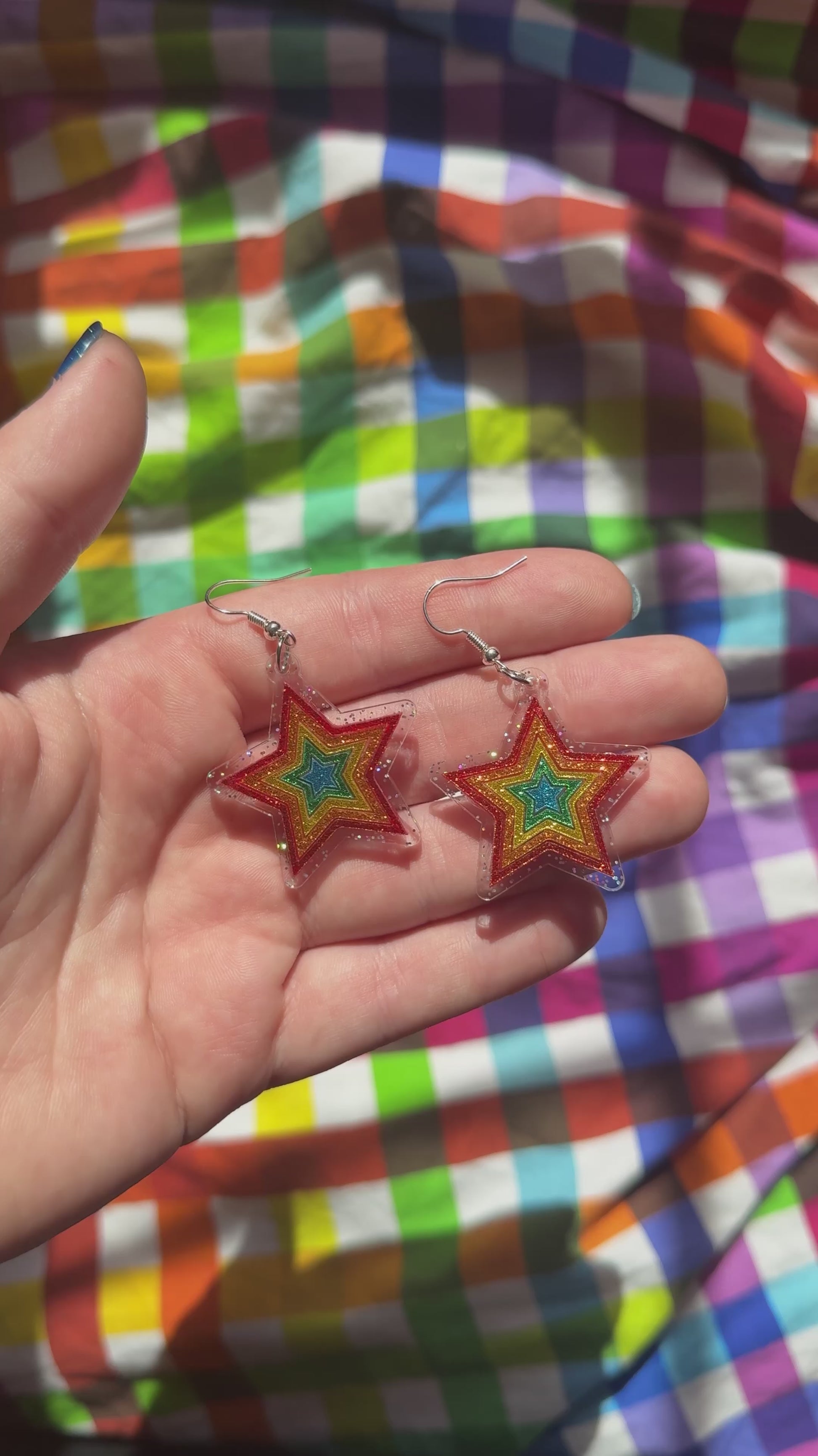 Shine bright with these vibrant Starburst earrings – a glittery celebration of colour and sparkle! Each earring features a star within a star within a star, cut from bold rainbow glitter acrylic for a fun, layered look that twinkles with every turn.
